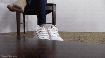 Arielle Lane walks into her office wearing a black leather jacket, tight blue jeans and a pair of white Sketcher tennis shoes. She sits down to see what is on the schedule, what she doesn’t know is there is someone hiding under her desk. The camera switches to POV and you get a nice close up of her shoes. Arielle takes off her shoes revealing her bare feet. Then a hand reaches out from under the desk and grabs a shoe. He sniffs it, getting a good smell of her shoes and foot oder. He loves the way they smell. Lots of closeups of her shoes with her feet in the background. After inspecting her one shoe, he grabs her other shoe and smells it too.
