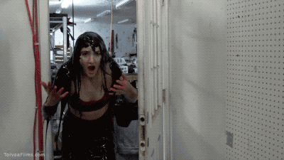 She pulls up to the empty warehouse, walks up the steps and enters through the steel door but when she closes it, the door locks and has caught her nice cardigan sweater, she struggles and pulls to get free but no matter how hard she pulls she can not get it out of the locked door. Finally she decides to take off her sweater. She walks around trying to be quiet in her high heeled boots, bending over looking in every spot. Giving us a great view of her beautiful body.