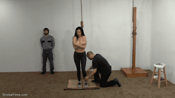 Kobe Lee is led by two guards to her execution. They walk up the steps to the gallows. She sniffles in remorse as she sees the throat rope over the trapdoor in the floor. The executor removes her handcuffs and strips her tank top. She tries to cover herself as he removes her bra and reveals her large tits. The sneakers are taken and the tight jeans shimmied off her hips. She is stripped as she cowers in shame. Handcuffed again, he puts her hair in a ponytail.