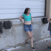 • Woman leaning against wall wearing a crop top exposing her belly.