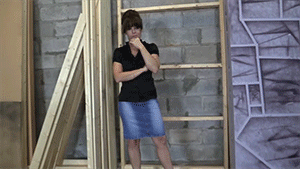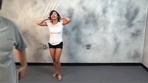 Arielle Lane cuffed with her hands in front of her and leg shackles. She is escorted by a police officer into a room. He tells her it is time to go to prison. He removes the handcuffs and leg shackles. When he goes to sit the cuffs down, she makes a run for it. She doesn’t get far, when he catches her he makes her put her hands on her head, lace her fingers together and walk backwards back to the room they were in. Once there, she is forced to strip to her panties.
