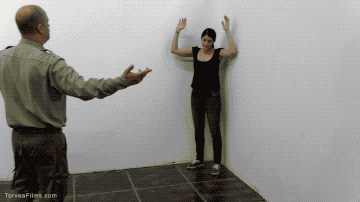 After a while of waiting, she is made to stand up and put her hands on the wall so he can search her. He checks her hair, behind her ears and gropes her breasts. He then turns her around and makes her stick her tongue out and move it around to make sure she isn’t hiding anything before he takes her away.