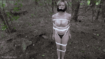 The man tells her that the reason this part of woods was chosen is it’s notorious for bugs at night time that like to bite. Hence the instruction by the dealer to have her stripped to her underwear. Scott states this area is quite secluded so know one will pass by. He will come back to ‘check up on her’ in the morning’ and leaves. She struggles against rope (close ups and full body shots shown)
