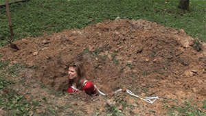 Again she begs him to help her. She tries to pulls up her underwear with her hand that is not stuck. Scott tells her that he has decided to help her.