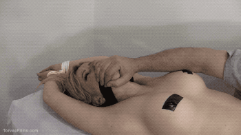 Jacquelyn comes to a halloween party where everyone’s missing. Distracted, she doesn’t see the vampire come up behind her to put his hand over her mouth. She finds herself stripped to a thong and black tape on her nipples. The vampire bares his teeth and body worships her curves. Grabbing her tits, he works his way down to her thighs and takes a bite while hand gagging her screams over the cleave gag. Mouth packing muffles her crying when he’s biting her neck. Her terror is more fun than if he mesmerized her!